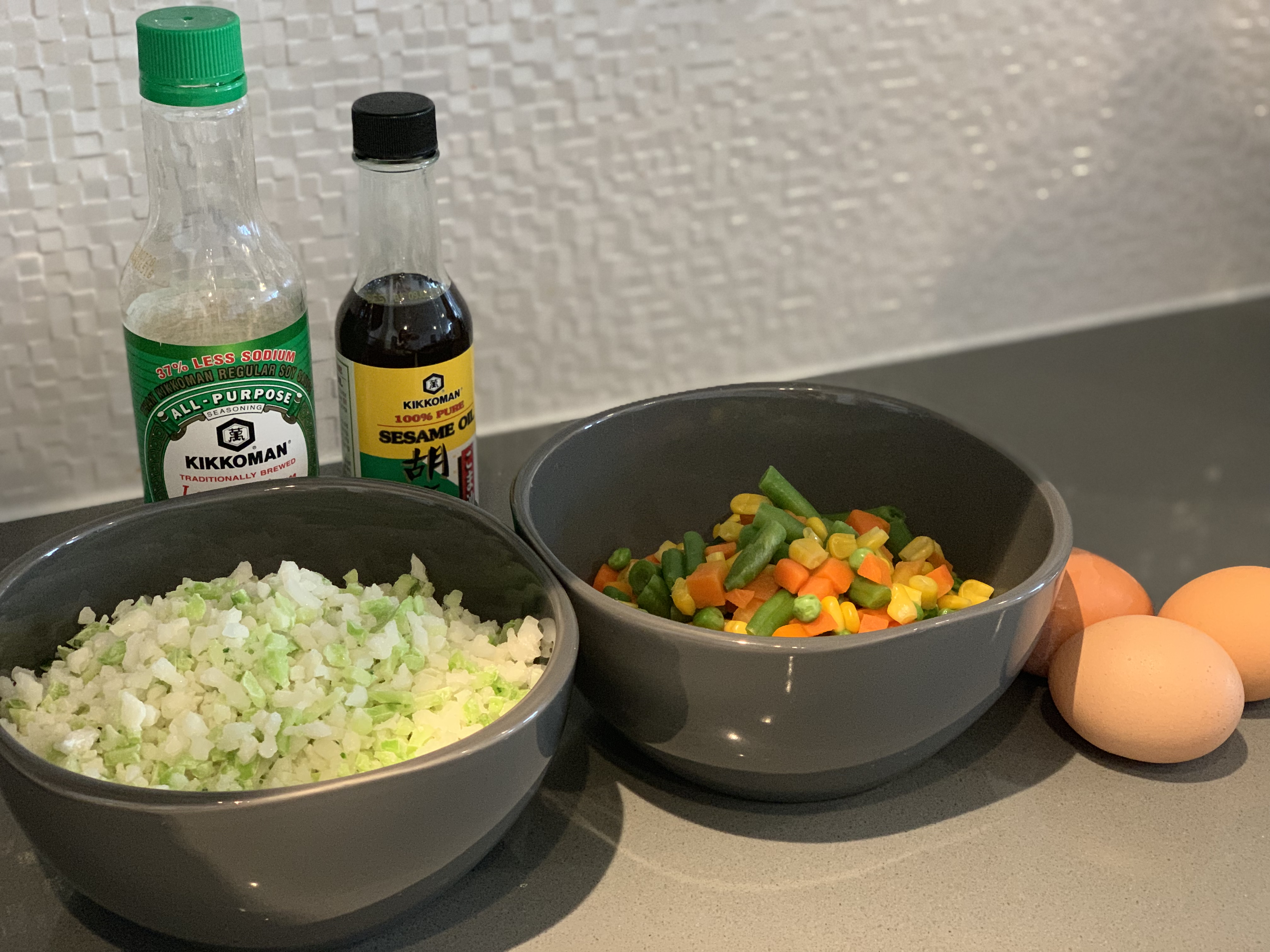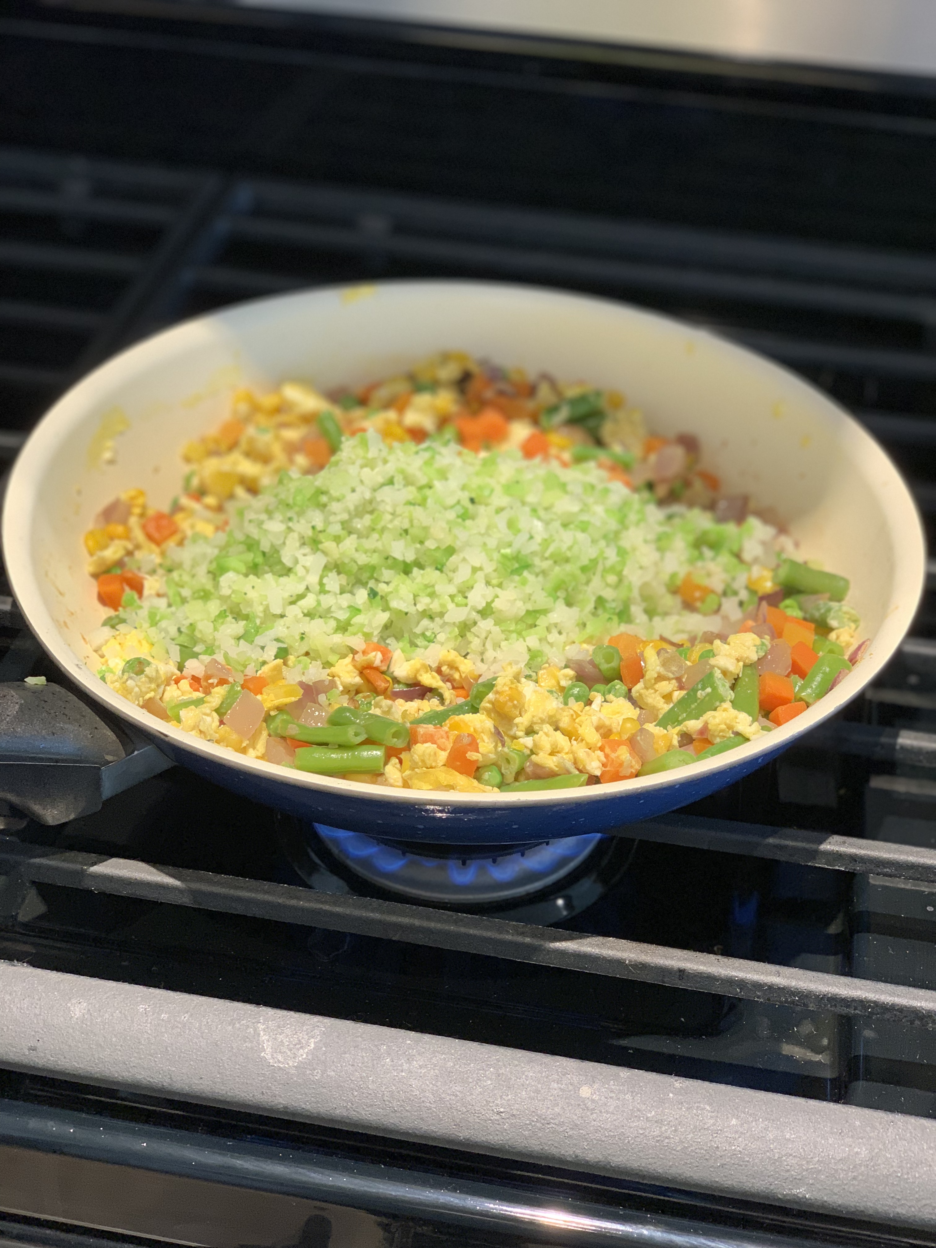 The prep time was about 15-20 minutes! Warm up the sesame oil in a pan, add the chopped onion and garlic and cooked it for about 5 minutes, turn down the heat right before the onion becomes caramelized. In a separate pan cook the riced veggies, this also takes about 5 minutes. Add the microwaved veggies to the onion/garlic mixture. Push this mixture to the side of the pan and use the other half of the pan to scramble 3-4 eggs (I used 3 this time). Once the eggs are cooked, add the riced veggies and add soy sauce to taste. I didn’t add salt to this recipe because the soy sauce is enough sodium for me, but if you feel you need to add salt, just salt to taste.